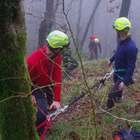 Na skupnem lovu je lovski pes med pogonom za divjadjo zašel v strm skalnat teren nad sotesko, iz katerega se sam ni mogel rešiti. Tudi lovci so ob pogledu na blatno in spolzko pobočje hitro ugotovili, da bi bilo reševanje brez vrvi tvegano. Poklicali so na 112 in nas zaprosili za pomoč.