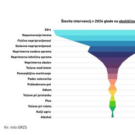 Zdrs ostaja najpogostejši vzrok nesreč v letu 2024 (25 %), tesno pa mu sledi nepoznavanje terena (24 %). Telesna nepripravljenost, ki pogosto sovpada s precenjevanjem lastnih sposobnosti, je tretji najpogostejši dejavnik (17 %). Prav tako ugotavljamo, da je v kar 22 % primerov glavni razlog za nesrečo neustrezna osebna ali tehnična oprema – kljub vse večjemu ozaveščanju o pomembnosti pravilne opremljenosti ta delež ostaja zaskrbljujoče visok.