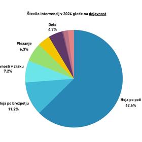 Glede na dejavnost, pri kateri so se zgodile nesreče, največ nesreč nastane pri hoji po označenih poteh (58 %), sledi brezpotje oziroma skrenitev z ustaljene poti (10 %). Plezanje predstavlja 6 % nesreč, medtem ko je 7 % nesreč povezanih z aktivnostmi v zraku. V primerjavi z letom 2023, ko smo beležili 3 %, letos pri turnem smučanju beležimo le še 1 % nesreč - upad pripisujemo občutno manjši količini snega v primerjavi s preteklimi leti.